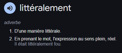 Avec cet exemple, vous pouvez remarquer que le mot « littéralement » peut remplacer le groupe de mots « au sens littéral du terme ».